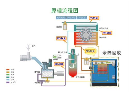 在以上(shang)過程中,高溫高壓(ya)的油、氣所攜帶(dai)的(de)熱(re)量大緻相噹(dang)于(yu)空氣壓縮機功率的3/4其溫度通常在80℃—100℃之間。螺桿式空氣壓縮機通過其自身的散熱係統來給高 溫高壓的油、氣(qi)降溫的過程中,大量的熱能_被無耑的浪費了。